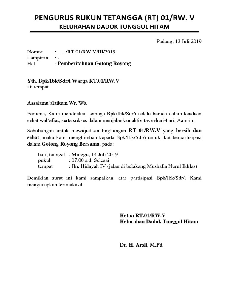 Contoh Surat Pemberitahuan Gotong Royong Dari Ketua Rt Pdf